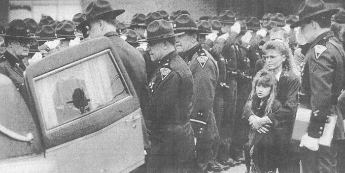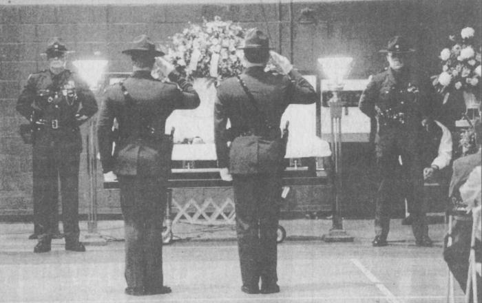 HARRISVILLE - On a gray, cloudy day in this small Ritchie County town, hundreds of police bid farewell to one of their own. More than 1,000 people, including more than 500 law enforcement officers from at least five states, honored Trooper Larry G. Hacker on Monday as a proud family man and a fallen comrade. "I could stand up here all day and ask why," said Trooper Ronald Blevins, a pastor who trained Hacker when he joined the force in 1989. "I've always heard that God takes the best." Hacker, 34, was shot Thursday night when answering a call to mediate a dispute between two neighbors in rural Ritchie County. He died early Friday at a Parkersburg hospital. One of the neighbors, 67-year-old Dennis Ferguson of Pullman, was arrested for the shooting and charged with first-degree murder. Authorities say he shot Hacker in the left side as the trooper approached Ferguson's home. The shooting shook Ritchie County and members of the law enforcement community, who considered Hacker a friendly, outgoing man who loved his work, his church and his family. Monday's funeral services at Ritchie County High School drew a standing-room-only crowd. As Hacker's open casket lay surrounded by more than a dozen flower arrangements, most of the crowd found seats at least 30 minutes before the funeral. Although the dimly lit gymnasium was full of people, the room was uncommonly quiet. Aside from occasional sniffles, the hum of electricity from ceiling lights were the only sounds to be heard.