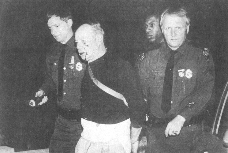An unkempt Dennis Ferguson, 67, is escorted to an ambulance early Friday morning by West Virginia State Police. He was charged with the murder of Trooper Larry G. Hacker. The strap across Ferguson’s chest is for a holster.
